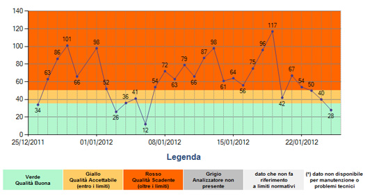 Com’è possibile vedere in questo grafico, negli ultimi 30 giorni, 22 volte il livello di polveri sottili ha sforato il limite giudicato accettabile dalla legge. In alcuni casi (29 dicembre, 1, 12, 18 e 19 gennaio) si è arrivati a doppiare quel limite. Se allarghiamo il campo, dal primo novembre 2011 ad oggi 26 gennaio (un totale di 87 giorni), il limite di Pm10 tollerato dalle norme è stato oltrepassato 50 volte. In altri termini, in circa il 60% dei giorni è stato registrato un inquinamento dell’aria troppo elevato.