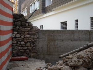 Il muro di cemento in via della Rinascita insieme a quello storico
