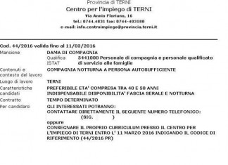 Terni, cerca “Dama di compagnia” con un annuncio al Centro per l’impiego