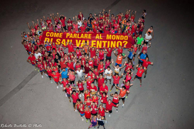Prima della partenza è stata organizzata una scenografia: un cuore formato dai partecipanti in maglia rossa che sono stati fotografati dall’alto, con in evidenza lo striscione: “Come parlare al mondo di San Valentino?”. A seguire lo start dei 120 podisti appartenenti a tutti i gruppi di Terni che per un chilometro hanno corso lentamente insieme fino a piazza Tacito, per poi affrontare un’allenamento per le vie della città, un giro da 7,5 chilometri “corso rispettando rigorosamente il codice della strada, sui marciapiedi e lungo la pista ciclabile in via Bramante e ritorno al Campo scuola Casagrande. A seguire la nutrita pattuglia dei camminatori arrivati allegramente dopo un giro accorciato di 6 chilometri”.