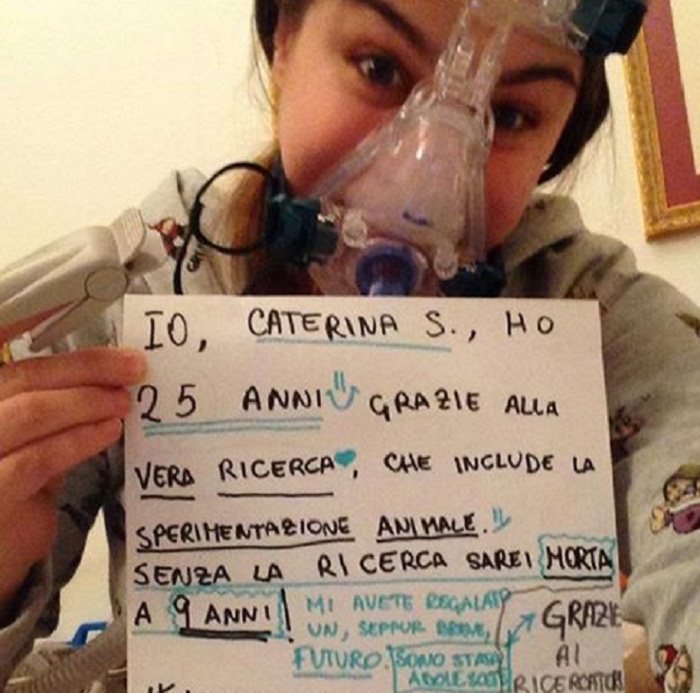 rare patologie, ha pubblicato una foto su Facebook (quella riportata qui a fianco). E’ stato il finimondo: quanto scritto sul cartello ritratto nella foto (“Io Caterina S. ho 25 anni grazie alla vera ricerca, che include la sperimentazione animale. Senza la ricerca sarei morta a 9 anni”) ha attirato l’attenzione di milioni di utenti di Facebook.