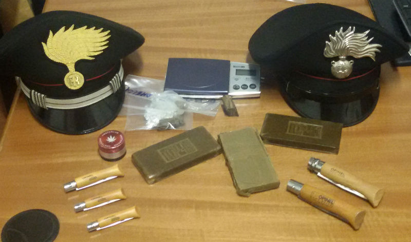 Il 29enne, al quale è stata sequestrata la dose appena acquistata, è stato segnalato per l’ennesima volta alla prefettura di Terni quale assuntore di droga. Ben diverse le conseguenze per lo spacciatore, un 32enne di Montefranco (Terni) operaio in una ditta del posto e con precedenti per spaccio. Nei suoi confronti è scattata la perquisizione personale e successivamente quella in abitazione. Addosso gli sono stati trovati i 40 euro appena incassati ed altri 2 grammi dello stesso stupefacente. In casa il ritrovamento decisamente più consistente: ben nascosti nella camera da letto, i carabinieri hanno trovato 3 panetti di hashish, ciascuno da 100 grammi, tutto l’occorrente per la pesatura ed il confezionamento delle dosi e 5 coltelli a serramanico con lame di varie lunghezze.