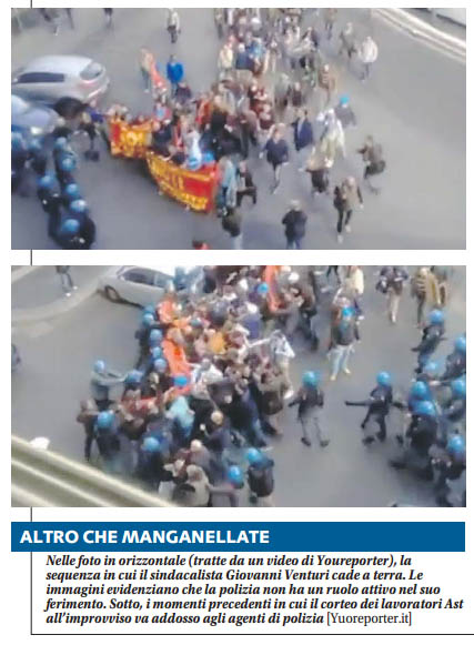 Aggiornamento ore 15,35: Questa è la ricostruzione che Libero fa nella sua edizione cartacea: “«Farò tutto quanto possibile per chiedere spiegazioni e per avere giustizia. Forse non riuscirò a riconoscereil poliziotto che mi ha colpito,ma le responsabilità dei fatti sono evidenti. Tutto è stato creato assolutamente ad arte per creare disagio. Ripeto, è stato un episodio gravissimo che non passerà in cavalleria». Diceva così Gianni Venturi, il dirigente Fiom caduto a terra durante la manifestazione a Roma degli operai delle acciaierie di Terni, in un’intervista al «Resto delCarlino». Peccato che la manganellata non l’abbia presa. É stato colpito da fuoco amico: un video che gira sul web lo dimostra chiaramente. Un compagno, col pugno destro alzato nel tentativo forse di difendersi (o di menare), riesce a far cadere Venturi -presumiamo involontariamente, visto il parapiglia – e poi a dileguarsi. Il sindacalista cade a terra, stordito, e la polizia non solo non lo manganella, ma addirittura cerca di fare un cordone protettivo”.