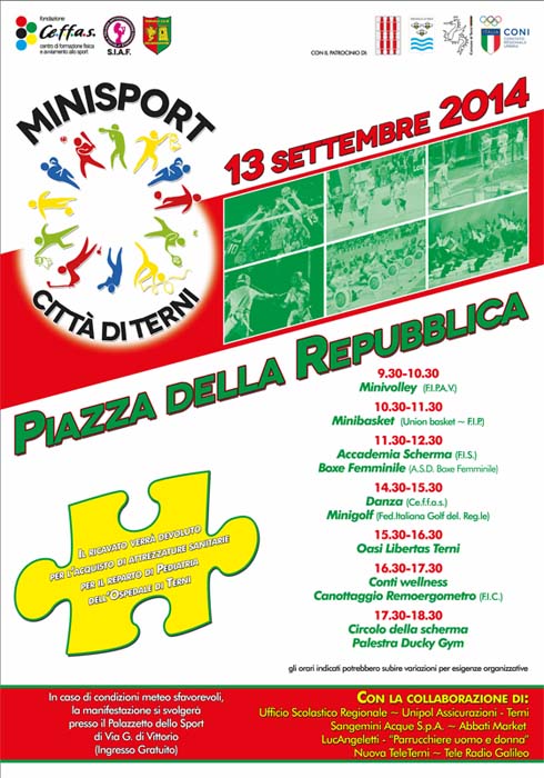 Campioni già affermati e atleti in erba, insieme per diffondere lo sport e aiutare il prossimo. È decisamente positivo il bilancio della prima edizione di “Minisport Città di Terni”, manifestazione organizzata da Fondazione Ceffas, Ternana Club “Rocca Rossoverde” e Scuola Italiana Antiaggressione Femminile, che si è tenuta nell’intera giornata di sabato scorso in piazza della Repubblica.
