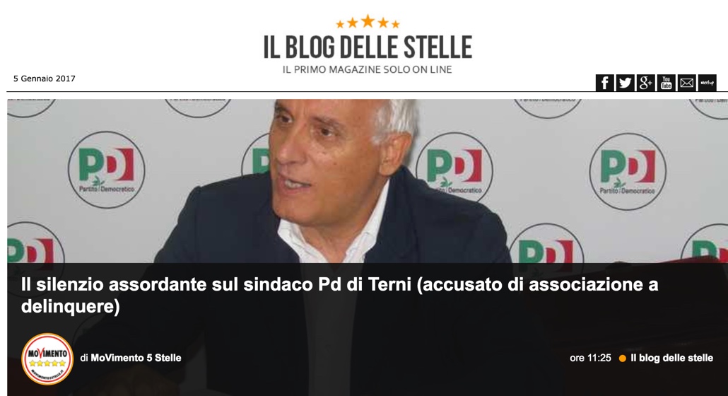 Il sindaco di Terni è indagato per gravi reati ma i media nazionali tacciono perché si tratta di un esponente del Partito Democratico. L’accusa rivolta al mondo dell’informazione arriva dal blog di Beppe Grillo, principale organo di comunicazione del Movimento 5 Stelle. E’ contenuta in un post pubblicato questa mattina a firma del M5S di Terni.