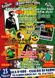 Ha affidato il dj set aperitiviggiante ad ANDY L’ORBA dj hip-hop che insieme ad un altro importante dj ternano ALEXJ hanno curato tutta la fonica dell’evento. Dopodichè l’attenzione è stata monopolizzata dai KAWA SOUND SYSTEM che hanno intrattenuto i presenti con i loro vinili reggae. Hanno inoltre usufruito del palco anche la ONDE ROOTS, band romana che coverizza pezzi di Bob Marley rendendo un’onorevole tributo al re delle good vibes. Il piatto forte della serata però è stato sia dal punto di vista tecnico ma soprattutto dal punto di vista scenico il calcare il palco dell’Ala d’Oro di Gualdo dalla band di Bobby Roots. Tale band si chiama JAMMING BAND e nella loro esibizione del 25 ultimo scorso hanno avuto come special guest Adriano Bono ex cantante delle Radici nel Cemento. Hanno performato assieme alcuni pezzi delle Radici come Cicileu ed Ansai come ce piace. La Jamming è stata supportata dai Mammaliga alla batteria e ci ha fatto vibrare con i loro pezzi inediti. Bobby è stato l’abile ideatore della serata e manipolatore del nostro cattivo umore tagliandogli la testa con la sua frizzante simpatia e la sua presenza scenica che nel frangente insieme ad Adriano Bono ha toccato il suo culmine massimo.