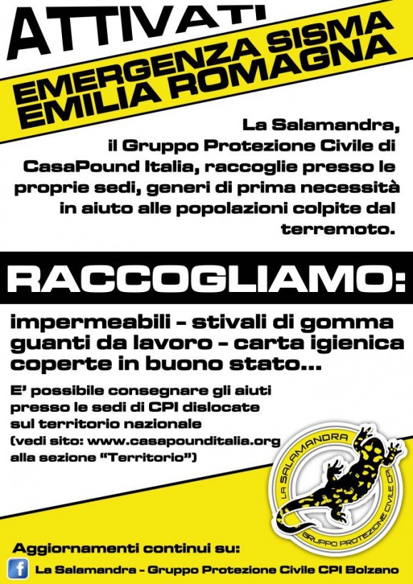 Il terremoto in Nord Italia, e soprattutto in Emilia Romagna ha inevitabilmente provocato sfollati che richiedono aiuto e macerie da rimuovere. Per aiutare le zone terremotate “CasaPound Italia Terni tramite il suo gruppo di protezione civile La Salamandra è attiva da questa sera nella raccolta di: stivali di gomma, carta igienica, coperte in buono stato, guanti di lavoro e impermeabili”. Il materiale viene raccolto in tre punti: uno a San Valentino, uno a Stroncone ed uno a Narni. Per informazioni sulle modalità di consegna è possibile telefonare al 3397683414 o inviare una mail a [email protected].