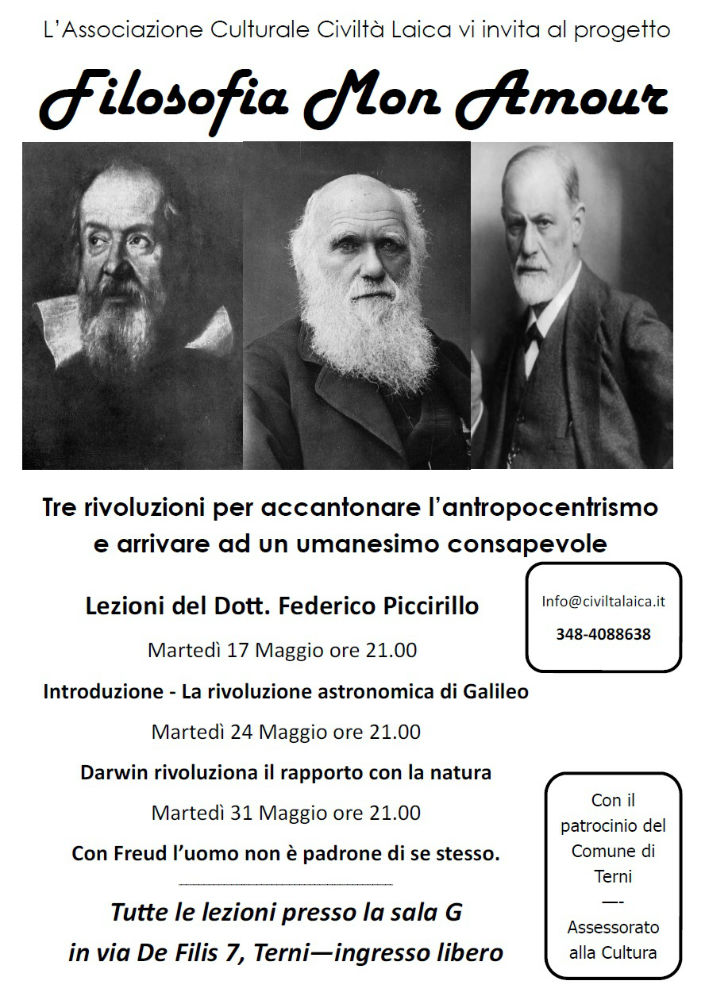 Spiega l’associazione: “Il progetto Filosofia mon amour, ovvero una scuola popolare di filosofia, si arricchisce di nuove esperienze e di nuovi docenti, dopo il Prof. Marcello Ricci quest’anno si propone come relatore il Dott. Federico Piccirillo che si impegnerà ad illustrare le rivoluzioni di pensiero che hanno demolito il concetto antropocentrico, ovvero quelle di Galileo, Darwin e Freud”.