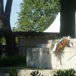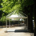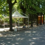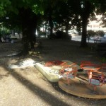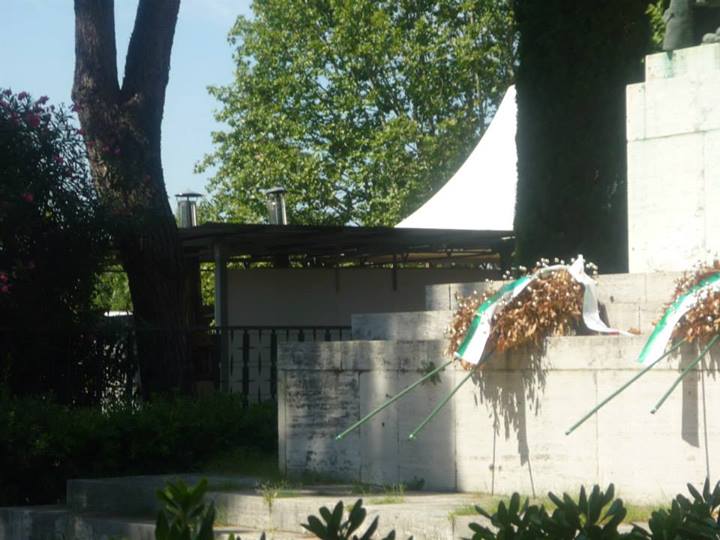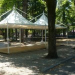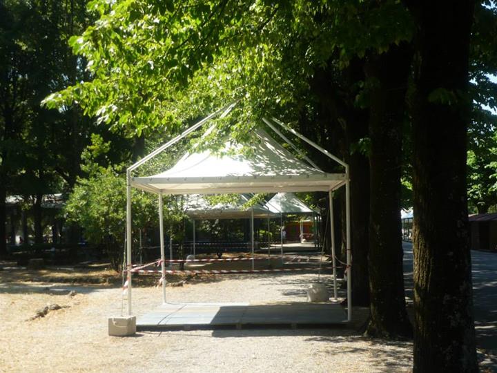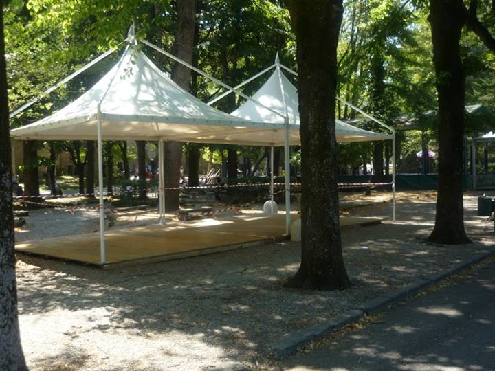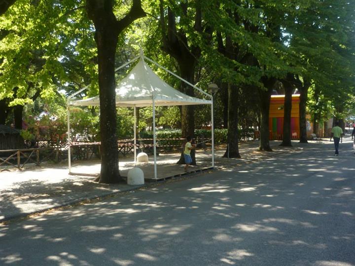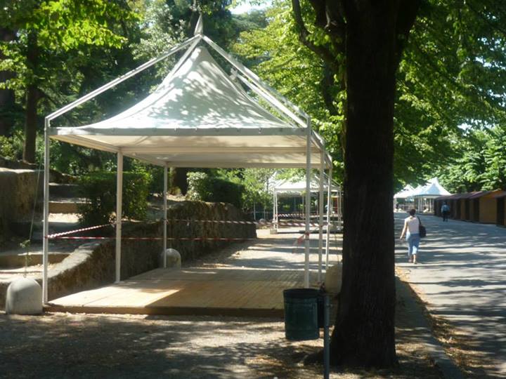 Finalmente arriviamo al principale parco cittadino e lo spettacolo documentato dalle nostre foto rende perfettamente l’idea dello scempio messo in atto dagli organizzatori della Festa Democratica. Senza ritornare sui temi ormai largamente dibattuti da decine di soggetti diversi, a noi ci preme sottolineare che ammesso e non concesso che la Festa possa iniziare, sicuramente non potranno farlo nel modo in cui stanno allestendo le strutture. Abbiamo contato oltre venti gazebo montati nelle aiuole, nelle aree verdi, attaccati ad alberi, statue, reperti archeologici, in contrasto con il parere seppur favorevole della sopraintendenza ma che escludeva simili ipotesi. Abbiamo visto bambini giocare all’interno di questi gazebo ancora non installati completamente, personale della ditta esecutrice dei lavori fare a zig zag con muletti e camion fra le famiglie a passeggio, eseguire lavori ad altezze che implicano elmetti ed indumenti di sicurezza con operai in abbigliamento balneare senza pinne naturalmente. Anche qui cestini e cartacce fanno bella mostra di se.