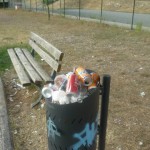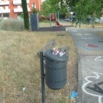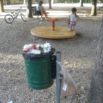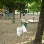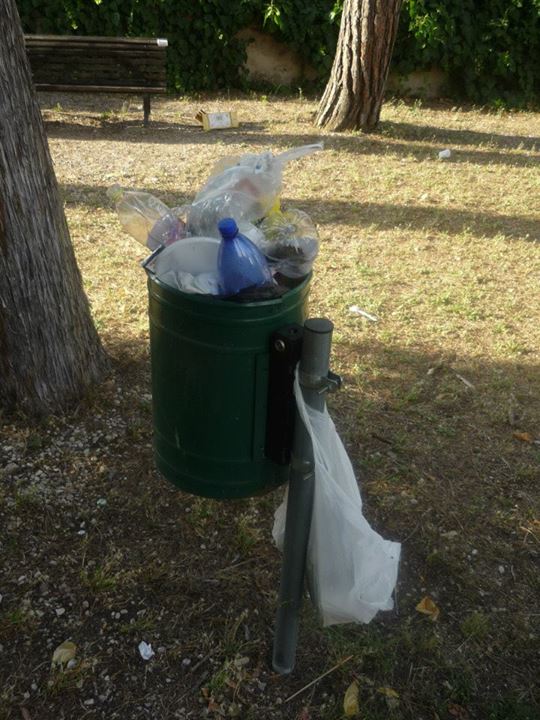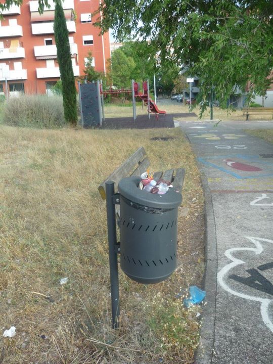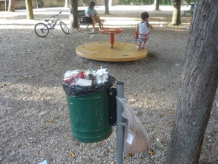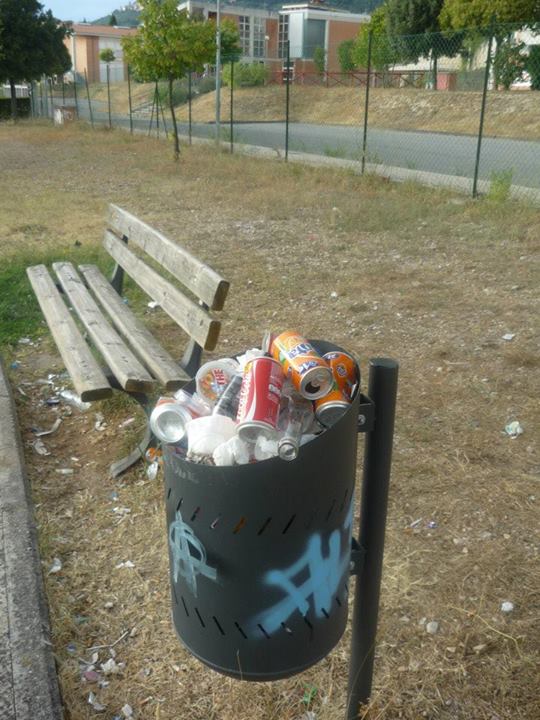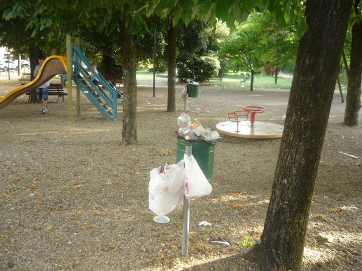 In questa zona di Terni ormai destinata al ripopolamento zanzare tigre grazie a due ex fontane trasformate in acquitrini puzzolenti, va in scena il festival del cestino stracolmo. Non pensiamo che questi giardini siano molto frequentati ed il fatto che i cestini oltre ad essere stracolmi presentano tutti sacchetti aggiuntivi ai lati, oltre ai rifiuti comunque lasciati in giro, è segno evidente che le operazioni di svuotamento degli stessi e di pulizia in generale sono fatti raramente. I giochi per bambini sono in uno stato pietoso come si vede dalle foto.