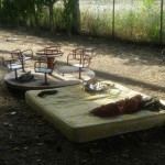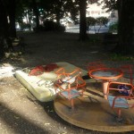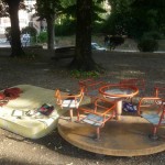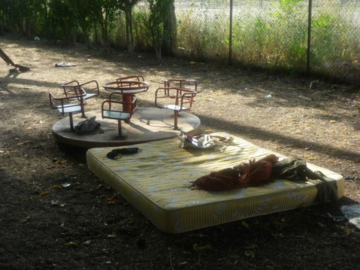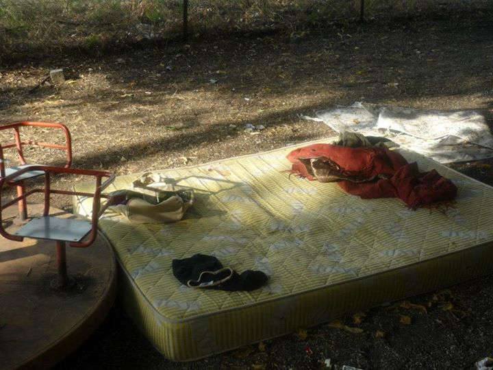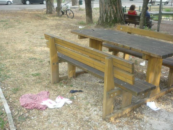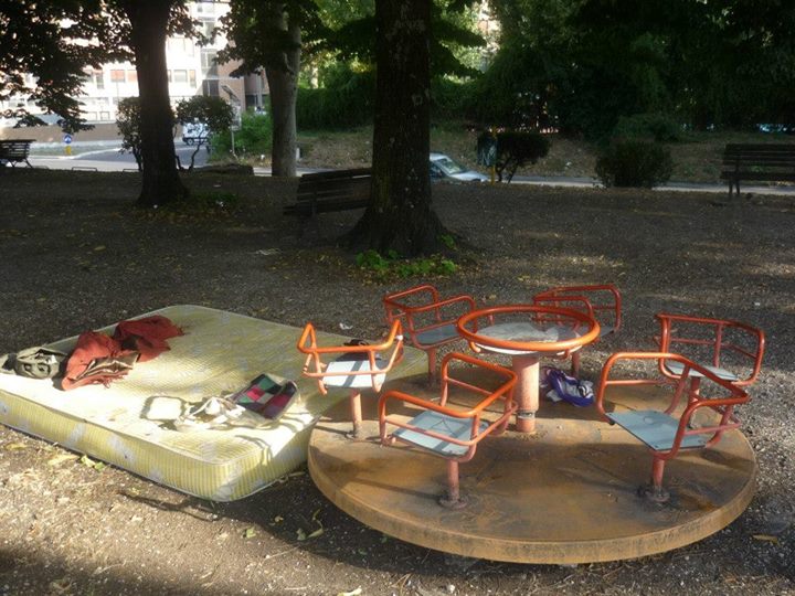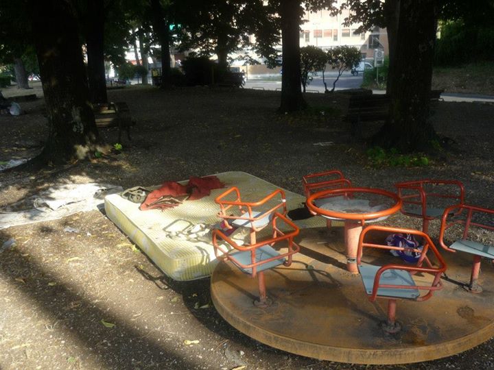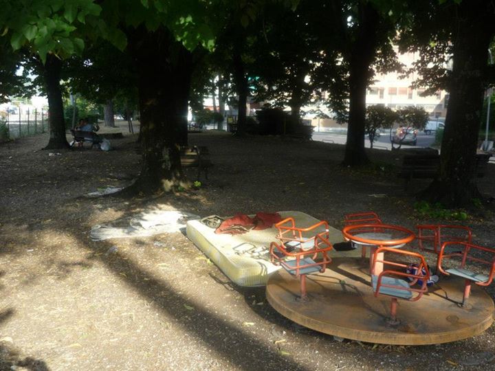 Tornando verso il centro cittadino ci siamo fermati in quelli che una volta erano fra i più bei giardini della città, adesso come si può chiamare un’area giardino se non c’è una panchina integra , i cestini li hanno direttamente tolti, l’erba si è estinta ed udite udite un bel materasso matrimoniale con capi di abbigliamento femminili adagiati sulla giostrina vicina a mo di comodino, vi accoglie al vostro arrivo?