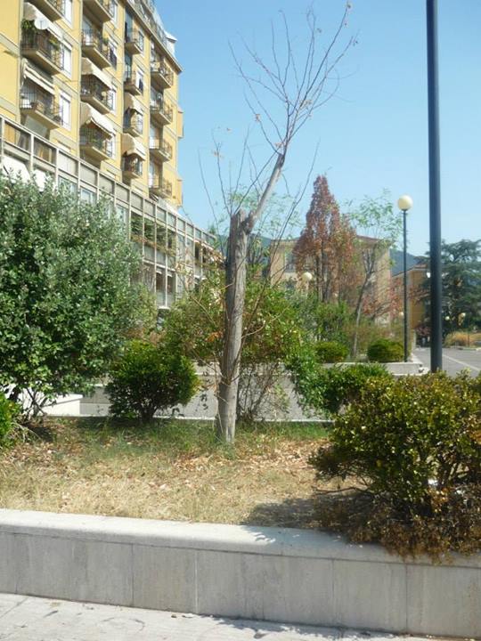 Qui lo scempio inizia ad essere preoccupante. Contiamo almeno una decina di alberi completamente secchi, oltre alle varie essenze arboree che una volta caratterizzavano le aiuole più lussureggianti di Terni, invece praticamente in via della Rinascita sembra essere autunno inoltrato alberi spogli e foglie marroni! Un vero danno ambientale ed economico per il Comune di Terni che adesso dovrà procedere al reimpianto di tutti gli alberi. Chiaramente anche qui i rifiuti sparsi non potevano mancare, è il degno prologo di quello che ci aspetta nel confinante parco Ciaurro.