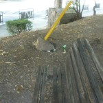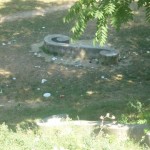 Notiamo il cancello di sicurezza del parcheggio interrato, che da sulla zona del vecchio mulino dove una volta c’erano fontane e ruscelli, completamente spalancato e proseguendo lungo il canneto capiamo il perche. Dopo aver camminato su un tappeto di rifiuti che ormai sono perfettamente integrati al manto erboso , sporgendosi un po’ dal vialetto si nota un anfratto utilizzato come rifugio notturno o come magazzino per la refurtiva visto che la bici fiammante che si trova all’interno non pensiamo appartenga a chi vi pernotta. Anche in questo parco stracci e vestiti abbandonati testimoniano bivacchi notturni, ed i rifiuti costeggiano le antiche mura senza soluzione di continuità.