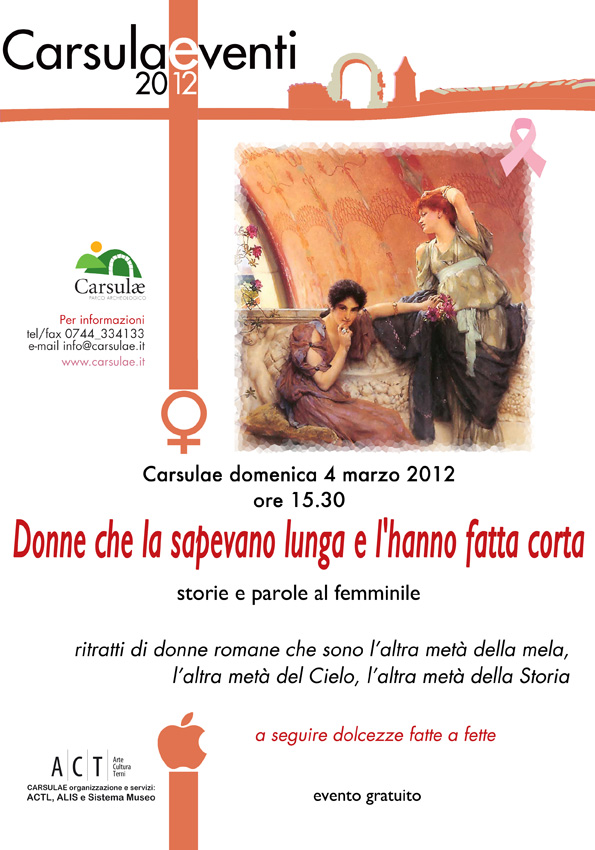 Domenica 4 Marzo 2012 alle ore 15:30, presso il Centro Visita e Documentazione “U. Ciotti” di Carsulae, si terrà la conferenza dal titolo “Donne che la sapevano lunga e l’hanno fatta corta – storie e parole al femminile“.