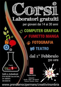 Il progetto “CreatTivi in Umbria”, in collaborazione con la Regione Umbria, si presuppone l’obiettivo di formare i giovani in questo vasto settore, proponendo otto laboratori dedicati alla creatività giovanile che si terranno dal primo febbraio tra Amelia, Narni, San Gemini, Giove e Penna in Teverina. I corsi, della durata di 50 ore, saranno incentrati su Computer grafica, Fumetto Manga, Fotografia, Produzioni musicali, Graffiti Art, Teatro e Sito web, e saranno dedicati ai giovani dai 15 ai 30 anni. Un percorso innovativo di crescita e formazione, emersione di talenti, avvicinamento al lavoro, produzione culturale e cittadinanza attiva. L’iniziativa si svolge grazie ad alcune aree giovanili dei paesi in questione, che si sono organizzate per condividere una nuova significativa esperienza di produzione culturale ai giovani delle comunità di appartenenza e dell’Umbria.