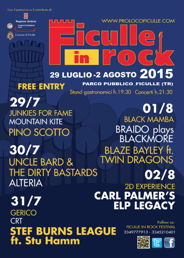 BAND EMERGENTI Spiega la Proloco che, “da tradizione, il Ficulle In Rock, accanto agli artisti di punta presenterà le migliori realtà emergenti del centro Italia, come i viterbesi 2D Experience e la all female band Black Mamba, entrambe band in forte ascesa negli ultimi anni. Gli orvietani Gerico e il loro imperdibile spettacolo – The Reunion. E poi ancora i reatini CRT, i ficullesi Mountain Kite e i giovanissimi Junkies for Fame”.