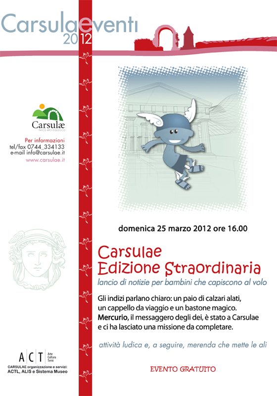 Domenica 25 Marzo 2012 alle ore 16:00, presso il Centro Visita e Documentazione “U. Ciotti” di Carsulae, si svolgerà l’evento ludico “CARSULAE, EDIZIONE STRAORDINARIA (Lancio di notizie per bambini che capiscono al volo)“.