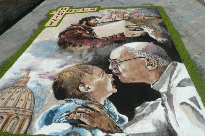 Infioratori di San Gemini sono stati scelti per rendere omaggio a Papa Francesco in occasione della festa dei santi Pietro e Paolo, Patroni di Roma del prossimo 29 giugno: realizzeranno in piazza San Pietro la stessa infiorata raffigurata nella foto a sinistra (ma di dimensioni molto più grandi). La Proloco di Roma di concerto con Infioritalia e Città delle Infiorate ha scelto infatti il progetto “Papa Francesco con i suoi gesti quotidiani e San Francesco, filo invisibile e conduttore tra il presente e passato” a cura di Cricchi Anna Rita e del suo Gruppo.