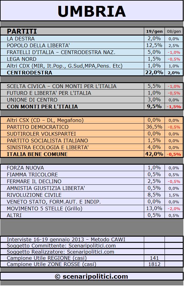 Due nuovi sondaggi fotografano le intenzioni di voto in Umbria per le elezioni politiche del 24 e 25 febbraio 2013: uno di Scenaripolitici, l’altro di Ipsos. Entrambi evidenziano un vantaggio di circa 20 punti percentuali del centrosinistra sul centrodestra. Sia per Scenaripolitici che per Ipsos la lista Rivoluzione civile guidata da Ingroia è intorno all’8%, soglia minima per ottenere un seggio al Senato. Il Movimento 5 Stelle sembra aver risentito proprio della crescita di Ingroia e si attesta oggi tra il 10% (per Ipsos) e il 13% (per Scenaripolitici). Discordanti i due sondaggi sulla coalizione guidata da Monti: per Scenaripolitici è sotto al 10%, per Ipsos intorno al 13%. Ancora più ampia la forbice su Pdl e Pd: il partito di Berlusconi per Scenaripolitici è al 12,5%, per Ipsos oltre il 18% mentre il Partito Democratico per Scenaripolitici è al 36,5% e per Ipsos intorno al 41%.