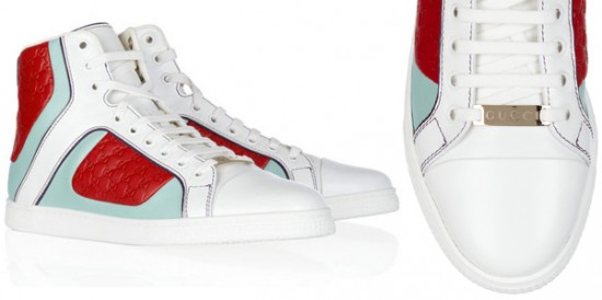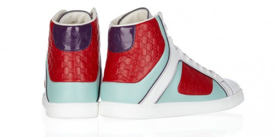 Anche Gucci si lascia prendere dall’imperante tendenza che vuole ai nostri piedi, con abbigliamento più o meno casual, ma non necessariamente, sneakers che somigliano alle basket di derivazione sportiva. Sono alte sulla caviglia, realizzate in candida pelle bianca con inserti multicolore, in rosso fuoco, viola profondo di vernice e un tocco di verde menta.