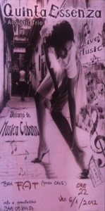 Eventi Archiviati MUSICA – Quinta Essenza live Di Terni Oggi - 5 Gennaio 2012 - ore 18:59 0 Condividi su Facebook Tweet su Twitter tweet Il 6 Gennaio alle ore 22 presso il bar Fat (vicino al Caos) si esibiranno i Quinta Essenza Acoustic Trio. Un gruppo musicale che omaggia la musica cubana con suoni ricercati e ritmi globali. Info e prenotazioni: 349 0984454 Stampa