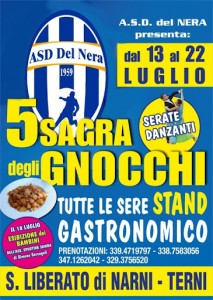 Dal 13 al 22 luglio, a San Liberato di Narni, si svolgerà l’evento gastronomico della “Sagra degli gnocchi“. Tutte le sere, dalle 19.30, nello stand gastronomico oltre agli gnocchi conditi con svariati sughi si potrà scegliere tre antipasti, carne alla brace e altro ancora. Il tutto sarà accompagnato dal buon vino del territorio e dalla musica dal vivo suonata dalle orchestre locali.