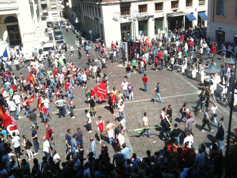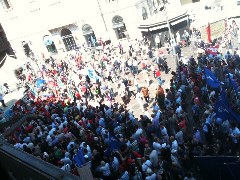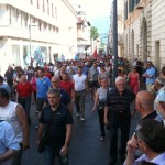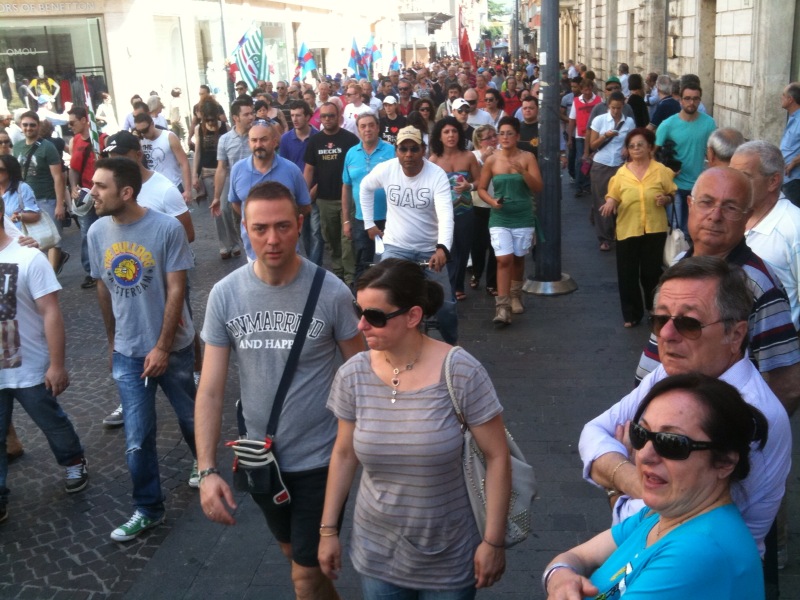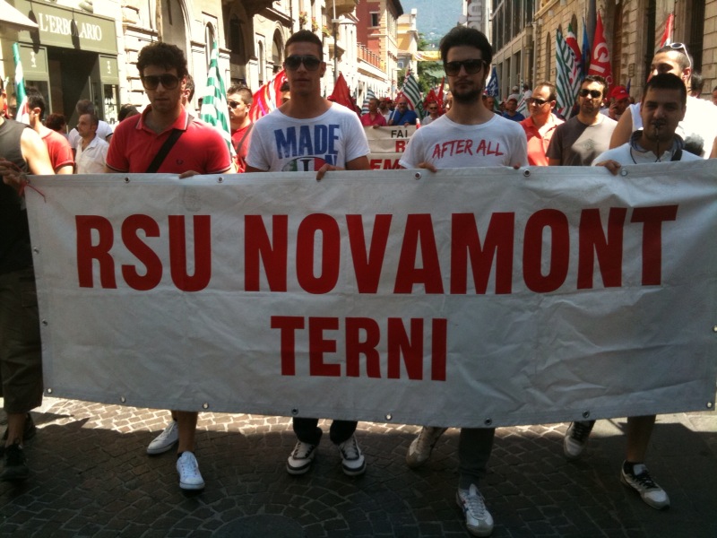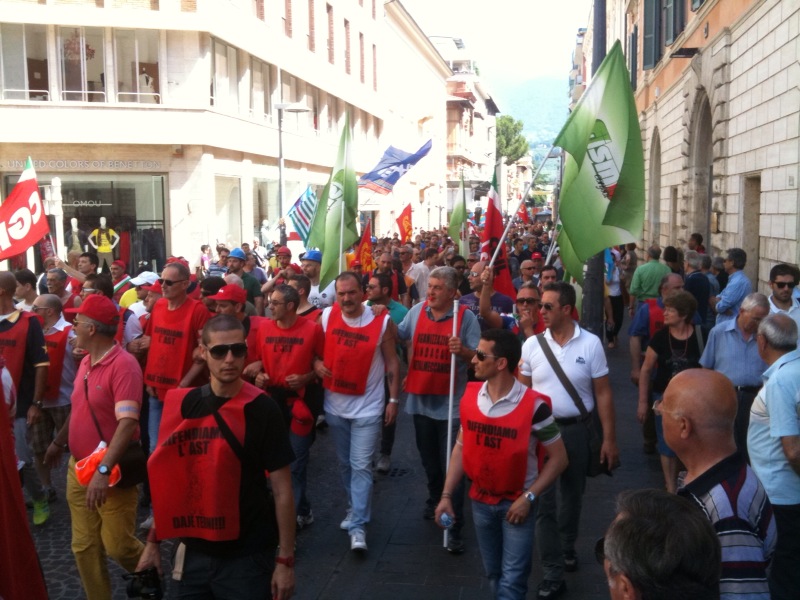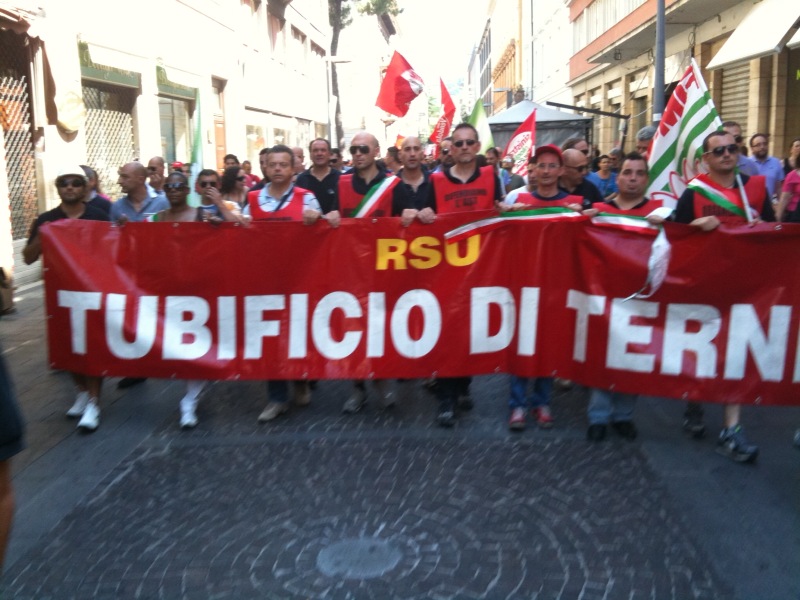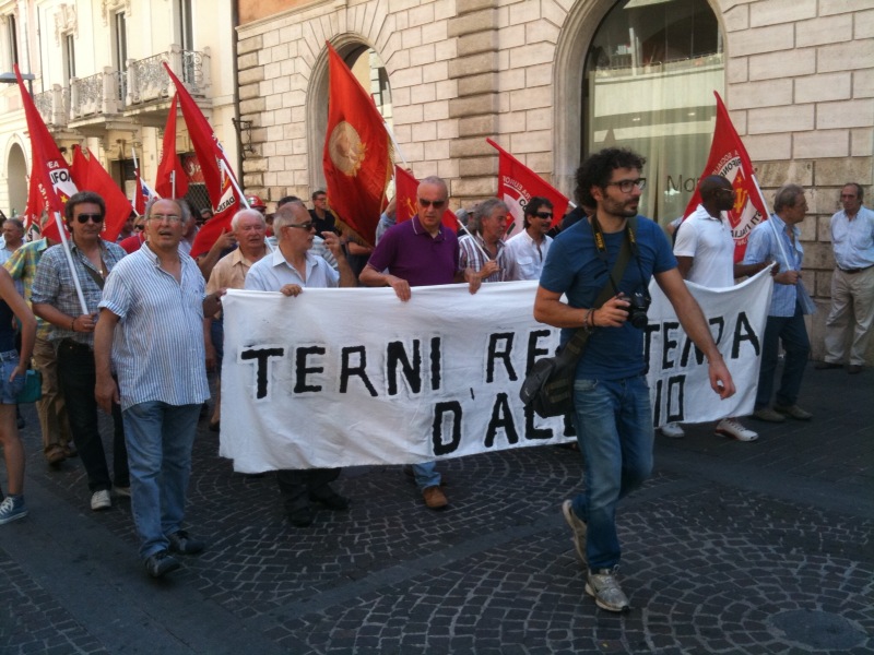 Questa mattina l’intera città di Terni si è fermata ed è scesa in piazza, in difesa delle proprie acciaierie. Migliaia di persone hanno preso parte al corteo, partito da viale Brin e giunto a Piazza della Repubblica dove si sono tenuti i discorsi di rappresentati istituzionali e sindacali. Moltissimi negozi e attività commerciali hanno abbassato la saracinesca ed affisso cartelli con messaggi solidali nei confronti dei lavoratori. Una partecipazione alla manifestazione che ricorda quella di febbraio 2004, con l’intera città mobilitata in difesa del reparto Magnetico. Oggi ad essere in pericolo è invece l’intera Ast, la cui sorte è nelle mani di manager finlandesi e politici dell’Unione europea.