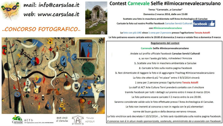 Domenica, unitamente alla festa di carnevale, avrà luogo anche un contest fotografico. Spiegano gli organizzatori: “Scattate una foto in maschera ambientata nell’Area Archeologica di Carsulae, caricate la foto sul nostro profilo Facebook Carsulae Servizi Culturali con #ilmiocarnevalecarsulano. La foto con più like vincerà una cena per due persone presso l’agriturismo Tenuta Astolfi”.