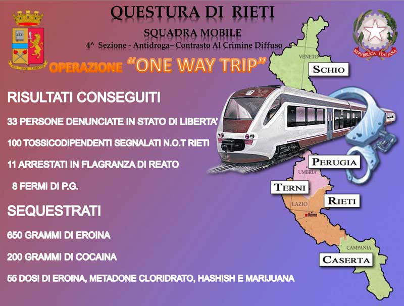Si ritiene di aver interrotto definitivamente tre distinti canali di approvvigionamento di sostanze stupefacenti a cui facevano riferimento dagli 80 ai 100 tossicodipendenti reatini e della provincia sabina i quali verranno successivamente tutti segnalati al locale Nucleo Operativo Tossicodipendenze.