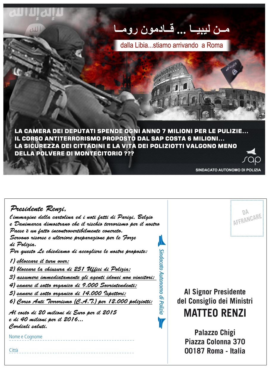 Una protesta che si svolge contemporaneamente in tutta Italia: la cartolina, indirizzata al premier Renzi, raffigura la nota immagine dell’Isis che conquista Roma con il Colosseo messo a ferro e fuoco. Un dato campeggia: “La Camera dei Deputati spende 7 milioni all’anno per le pulizie e non si trovano 6 milioni per un corso anti terrorismo col quale formare gli agenti che svolgono servizio di controllo del territorio?”.