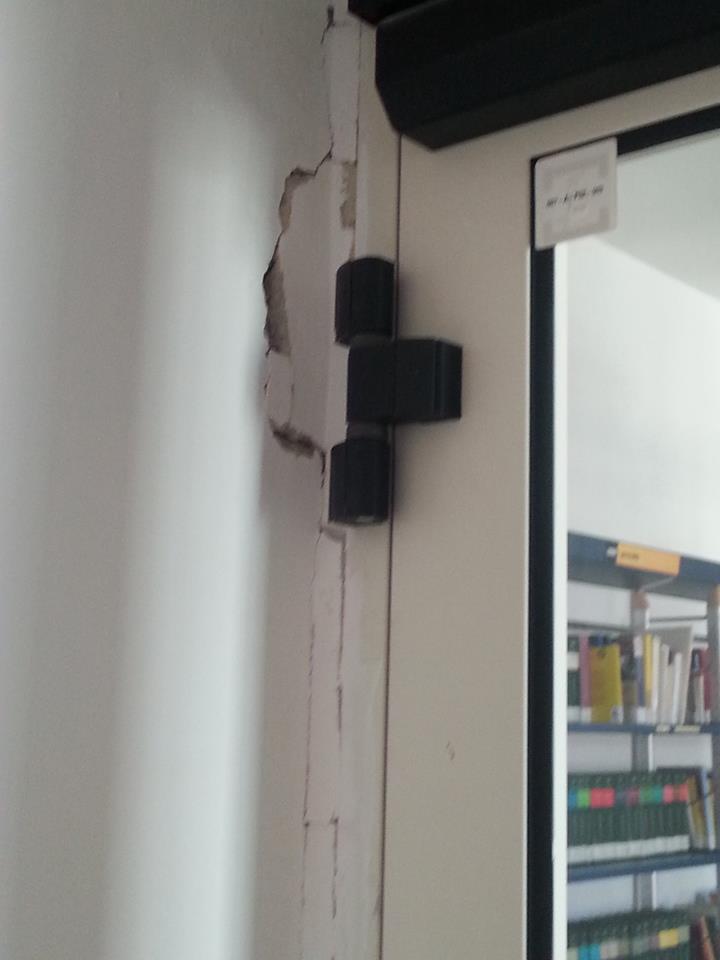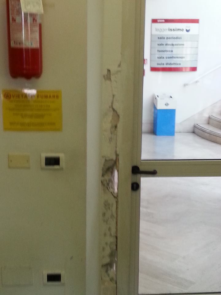Nell’interrogazione firmata da Federico Pasculli, Thomas De Luca, Valentina Pococacio, Angelica Trenta e Patrizia Braghiroli si parla di “una situazione preoccupante, soprattutto del lucernaio dal quale c’è una forte infiltrazione di acqua con tanto di scale ed area transennata a mo’ di scena del crimine, secchi disposti a drenare i flutti che discendono dall’alto e stracci e fogli di carta disposti a raggio intorno a tale inondazione. Oltre a questo sono visibili significative crepe sullo stesso e segni di erosione”. Inoltre “la porta della sezione periodici (che già soffre di mancanza fondi e per questo oggi vive di donazioni private) è in parte smurata e scardinata dal muro, su di una scala è poggiato un frammento significativo di muro staccatosi, vi è presenza di tracce di umidità e di crepe in diversi settori”.