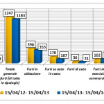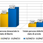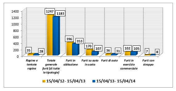Diminuiti i reati che “destano allarme sociale”: sono passati dai 1247 dello scorso anno ai 1183 del periodo attuale (-5%). In particolare, sono diminuite le rapine e le tentate rapine, passate da 35 a 28 (- 20%) ed i furti in abitazione che da 396 nel periodo precedente sono passati a 353 nel periodo attuale (-11%).