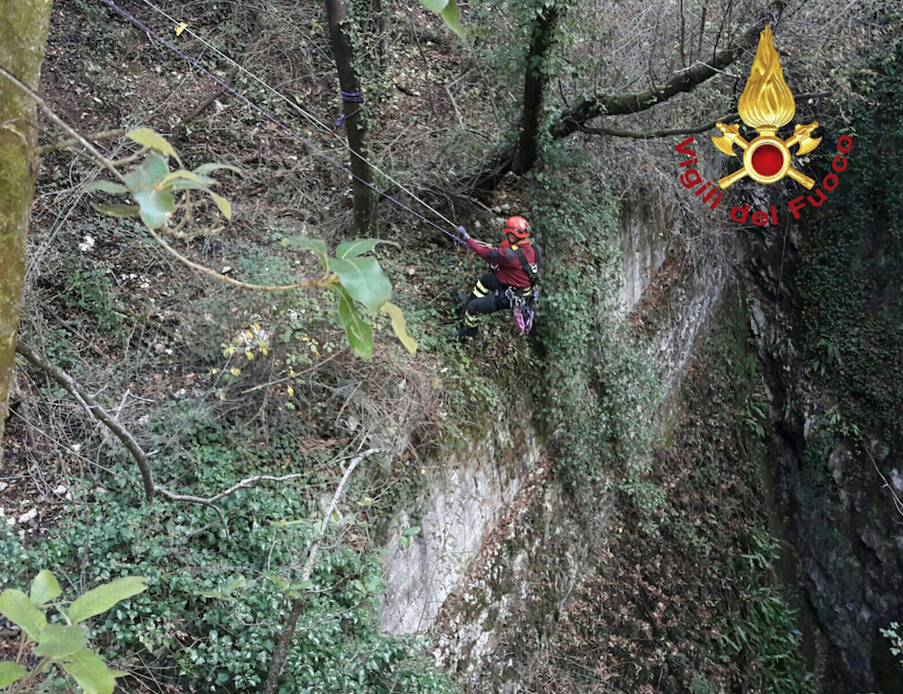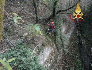 L’intervento, svoltosi con tecniche “Saf” (Speleo-alpino-fluviali), si è reso necessario per salvare un Jagdterrier, tipico cane da caccia al cinghiale, finito in un dirupo profondo 30 metri.