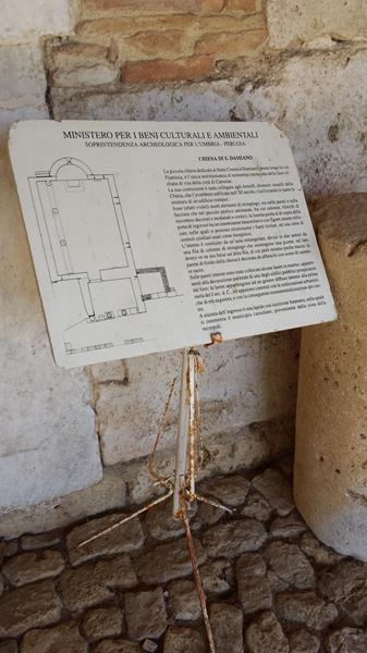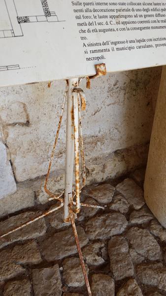 L’accesso all’area, inoltre, è sostanzialmente libero. I tornelli sono disattivati!!! C’è un cartello che dice che bisogna fare il biglietto, ma sta all’onestà delle persone girarsi e andare in biglietteria. Se si vuole un’area aperta al pubblico liberamente come era un tempo non ha senso affidarne la gestione a qualcuno da pagare con i soldi della comunità. Se invece si vogliono dare servizi… allora bisogna darli. La maggior parte dei pannelli informativi che dovrebbero far capire al turista cosa rappresentano quelle pietre sono illeggibili, talvolta divelti. Persino la tabella informativa dell’arco di San Damiano, il ‘simbolo’ di Carsulae e del turismo a Terni è illeggibile!!!