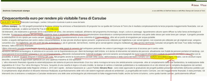 Ma vi è di più. Nel 2013 veniva annunciato lo stanziamento di ulteriore mezzo milione di euro (500.000,00 euro) da parte della Regione Umbria per – testuale – “la delimitazione di uno spazio per sosta camper, protetto da siepi e il posizionamento di una colonnina di ricarica elettrica, oltre ad un punto di erogazione per acqua potabile”; “convertire l’ex biglietteria in info point del sito archeologico e più in generale del territorio, mentre gli ex servizi igienici vengono riutilizzati per bike service”; “la decorazione delle pareti di cemento del sottopasso pedonale che unisce il parcheggio con il percorso di accesso per il centro visite”; “intervenire nel sistema dei percorsi, attualmente non fruibili da persone portatori di handicap, con nuovi percorsi di accessibilità autonoma o con accompagnamento, utilizzando esclusivamente materiali ecologici”. Inoltre si aggiungeva: “I percorsi saranno accompagnati da nuovi supporti informativi costituiti da pannelli orientativi e descrittivi con la possibilità, in alcuni, di avere integrato il sistema QR code”.