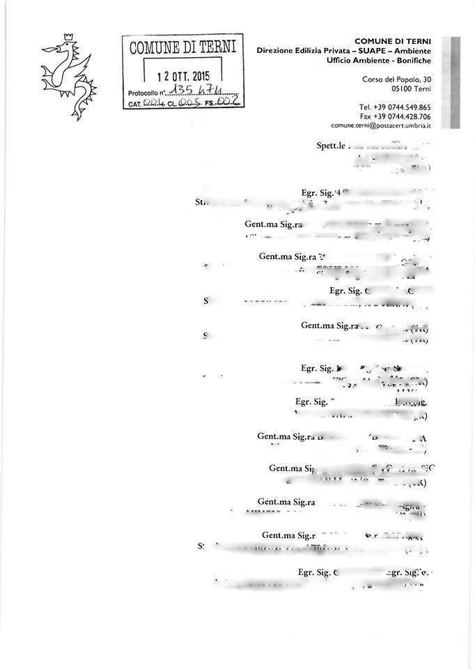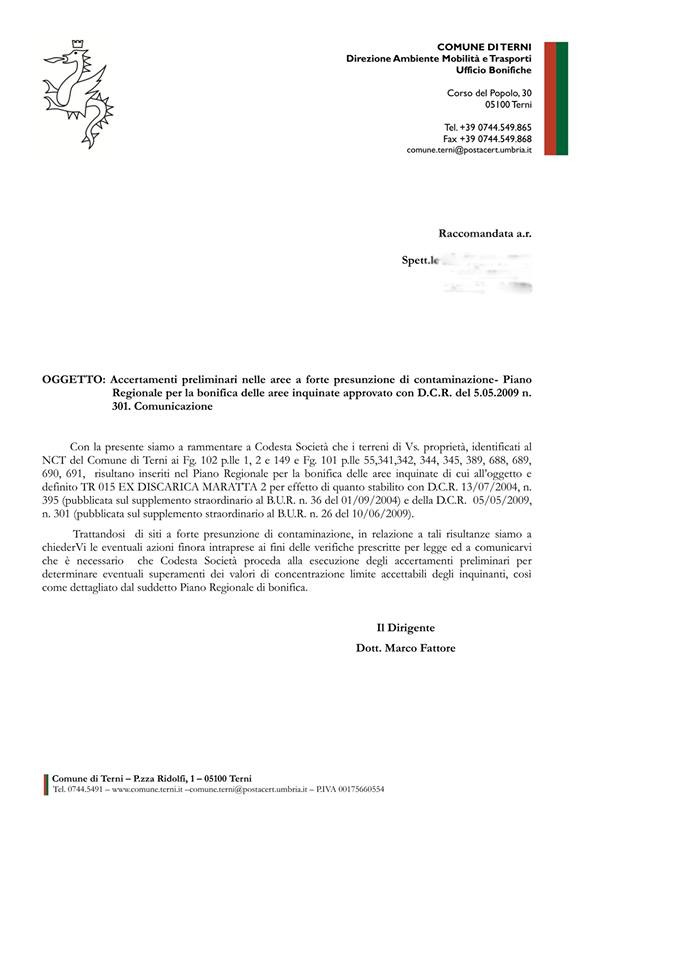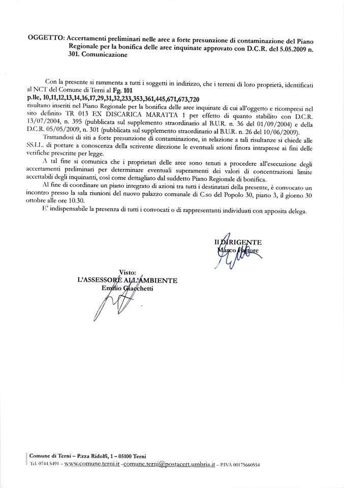 La scorsa settimana l’assessore all’Ambiente del Comune di Terni, Emilio Giacchetti, in una nota aveva scritto: “In merito al piano regionale di bonifica, e alla sua attuazione, dopo un’approfondita ricognizione degli atti amministrativi che si sono susseguiti dal 2004 ad oggi, si evince che per quanto riguarda i terreni di proprietà pubblica il Comune ha già dato da tempo avviato le procedure di analisi di rischio, come da norma di riferimento. Per quanto riguarda i terreni, la maggior parte, di proprietà privata, il Comune lunedì mattina ha inviato a tutti i proprietari le notifiche come da piano regionale di bonifica. Le notifiche contengono i principi fissati dal piano regionale, tra quali anche gli adempimenti a carico dei proprietari, compreso i relativi divieti. Gli argomenti introdotti dalla notifica saranno inoltre oggetto di approfondimento in un incontro in assessorato con i proprietari nel quale verranno approfonditi tutti i temi in questione. Tutta l‘attività e le procedure seguite dal Comune di Terni sono volte all’esclusivo interesse della tutela della salute dei cittadini e alla salvaguardia del territorio, attendendoci in questo caso anche al principio di precauzione. Ogni altro obiettivo esula dalla nostra azione amministrativa e dalla nostra persona”.