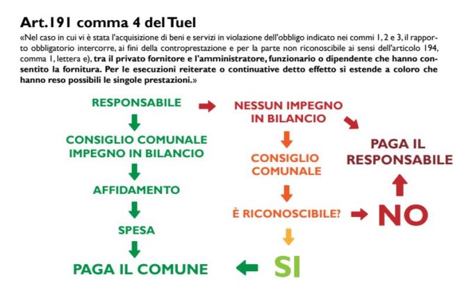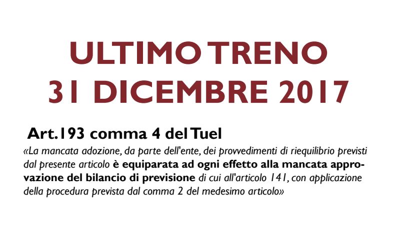“Il 31 dicembre 2017, così come confermato anche dalla dirigenza in commissione, ci sarà il termine ultimo per deliberare sui debiti fuori bilancio che DEVONO essere riconosciuti improrogabilmente dal consiglio. Le conseguenze di inadempimento oltre al commissariamento dell’Ente possono essere devastanti anche per tutti i funzionari e dirigenti che hanno commissionato le spese, anche per quelle dovute, in quanto potrebbero vedere recapitarsi richieste di pagamento da parte dei creditori anche in virtù degli accordi transattivi firmati senza deliberazione del consiglio comunale.