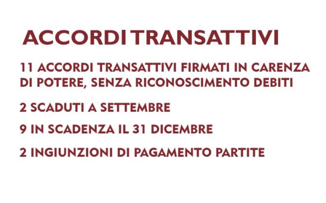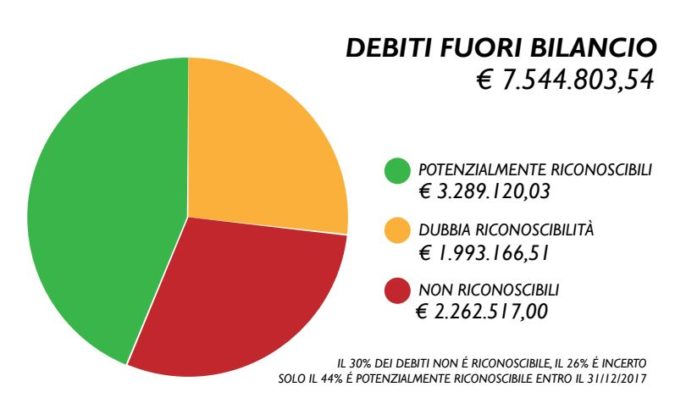 “In merito ai 7.544.803,54 euro di debiti fuori bilancio una nostra prima analisi ha fatto emergere come solo il 44% di questa cifra abbia i sufficienti requisiti richiesti dalla legge tali da poter essere riconosciuto come debito effettivo per l’Ente ed essere iscritto a bilancio e successivamente pagato, previo il necessario passaggio in consiglio comunale.