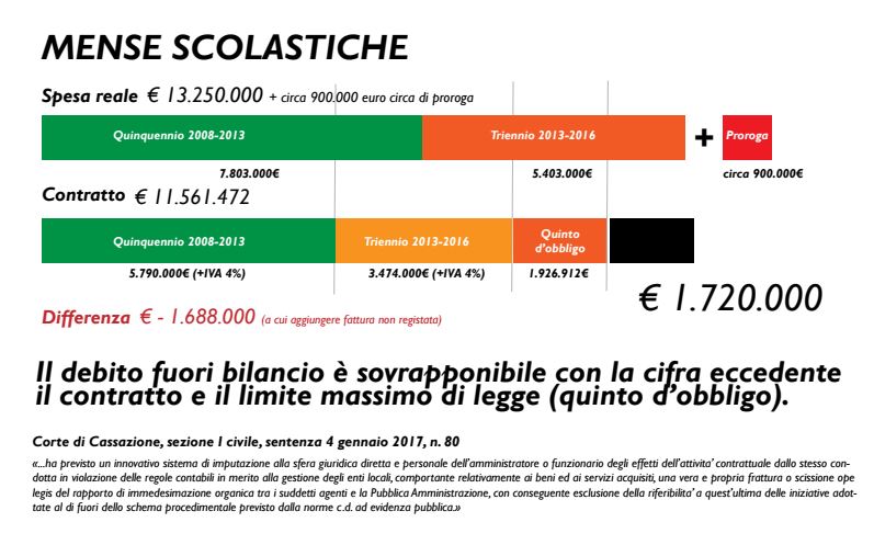 “Il caso del debito delle mense scolastiche è quanto mai, a nostro modo di vedere, riconducibile a questa fattispecie. Il contratto stipulato nel 2008 prevedeva un massimo dell’importo di 9.634.560 euro. Per legge la ripetizione dei servizi analoghi non può essere maggiore del 20% oltre all’importo dell’appalto (quinto d’obbligo). La cifra complessiva della spesa è stata di circa 13.250.000 euro, esclusa la proroga del 2017. In base ai dati che ci sono stati forniti quindi l’appalto è costato circa 1.688.000 mila euro in più rispetto al contratto, cifra quasi perfettamente sovrapponibile a quella di 1.723.000 euro (cifra indicata dall’amministrazione come debito fuori bilancio) se contiamo che manca una fattura non contabilizzata di cui abbiamo avuto notizia pochi giorni fa.