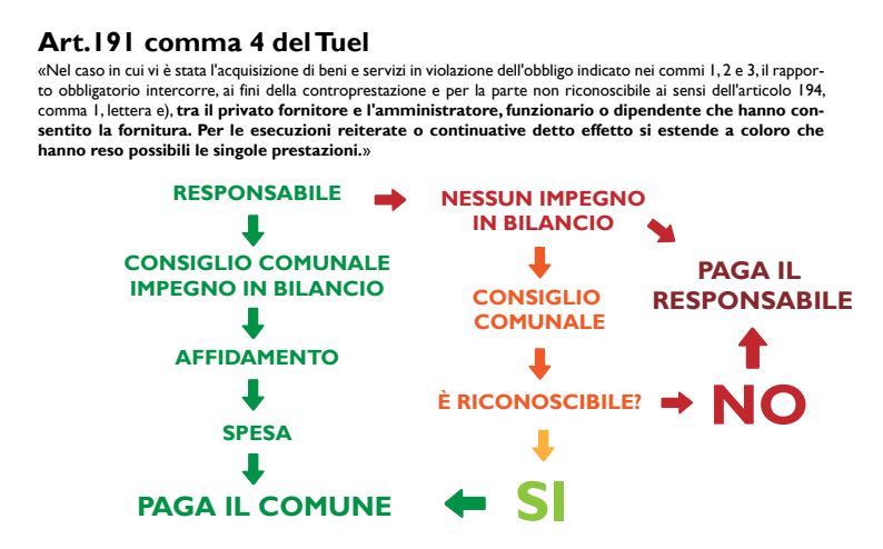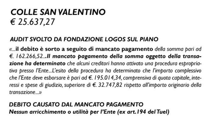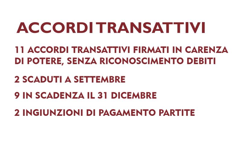 “Solo a titolo di esempio, il 15% del debito è costituito da fatture emesse tra il 1985 e il 2011, debiti la cui prescrizione potrebbe essere sopravvenuta già molto tempo fa, elemento questo che metterebbe in serio dubbio l’esigibilità dello stesso. Alcune fatture poi non risponderebbero dei requisiti di “utilità ed arricchimento” per l’ente che costituiscono la base imprescindibile per essere riconosciute e poi pagate dalla collettività. Una consolidata giurisprudenza inoltre ha pienamente sentenziato come le spese ordinate dai responsabili senza valido e formale contratto o affidamento non possono essere in alcun modo riconosciute.”