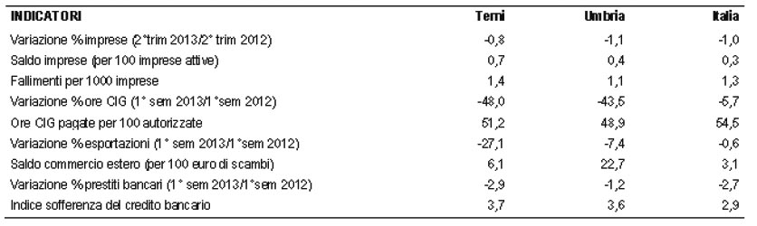 La Camera di commercio si sforza di parlare di “luci e ombre” ma a leggere i dati dell’Osservatorio provinciale sembra proprio buio pesto. A Terni l’economia è in continuo peggioramento: da giugno 2012 a giugno 2013 sono diminuite le imprese, le esportazioni, i posti di lavoro, i prestiti bancari, è aumentata la disoccupazione, è peggiorata la qualità del credito. Per scorgere qualche “luce” si fa quindi davvero fatica.
