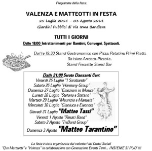 Si aprirà venerdì 25 luglio l’evento estivo “Valenza e Matteotti in Festa”: sostanzialmente una delle classiche sagre estive con stand gastronomico e serate danzanti ma con la particolarità dell’organizzazione che vuol rappresentare il primo tassello di un cambiamento nel modo di fare eventi nell’ambito del sociale.
