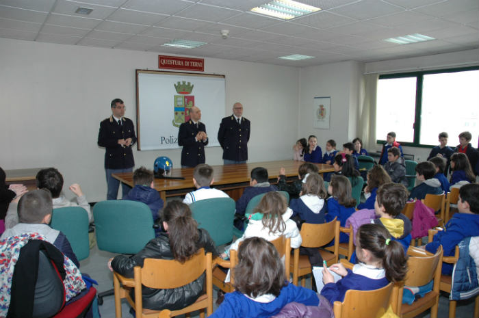 Un giorno diverso per gli alunni della 2° A e B e della 3° A della scuola elementare Mazzini. Una mattinata intensa, ma anche divertente e formativa, che li ha visti protagonisti nei corridoi e nelle stanze della questura di Terni di via Antiochia. L’occasione è stata l’iniziativa denominata “Educazione alla legalità”, sostenuta e portata avanti ciclicamente dalla questura in collaborazione con le scuole cittadine, nell’ambito del progetto ministeriale “Il Poliziotto, un amico in più”, che ormai da diversi anni vede impegnata la polizia di Stato in incontri regolari con i ragazzi delle scuole italiane.