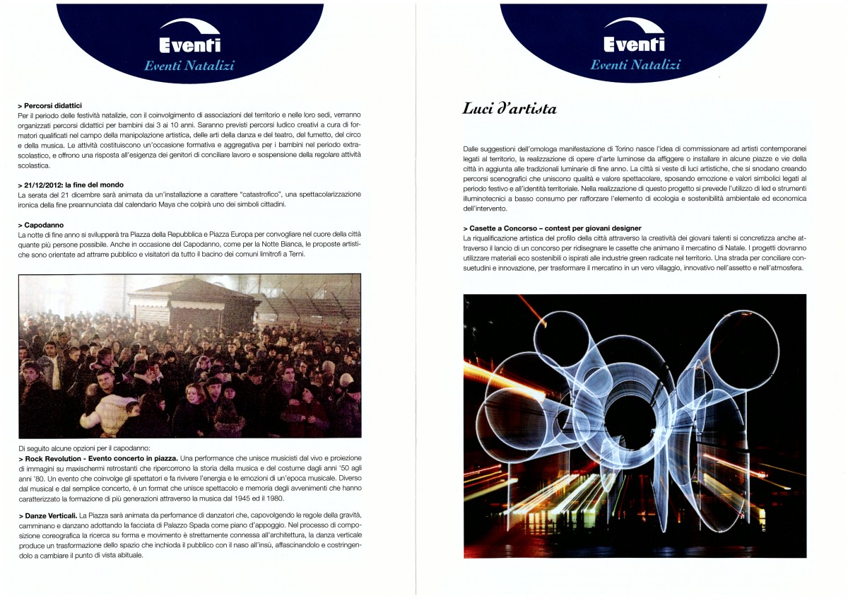 Per Rossi negli opuscoli di presentazione, Eventi srl ha annunciato iniziative che non sono poi state realizzate tra le quali una parata elettrica, una streetparade, un circuito musicale settimanale, spettacoli di danze verticali e luci d’artista ed infine la festa di Capodanno con “proposte artistiche orientate ad attrarre pubblico da tutto il bacino dei comuni limitrofi”.