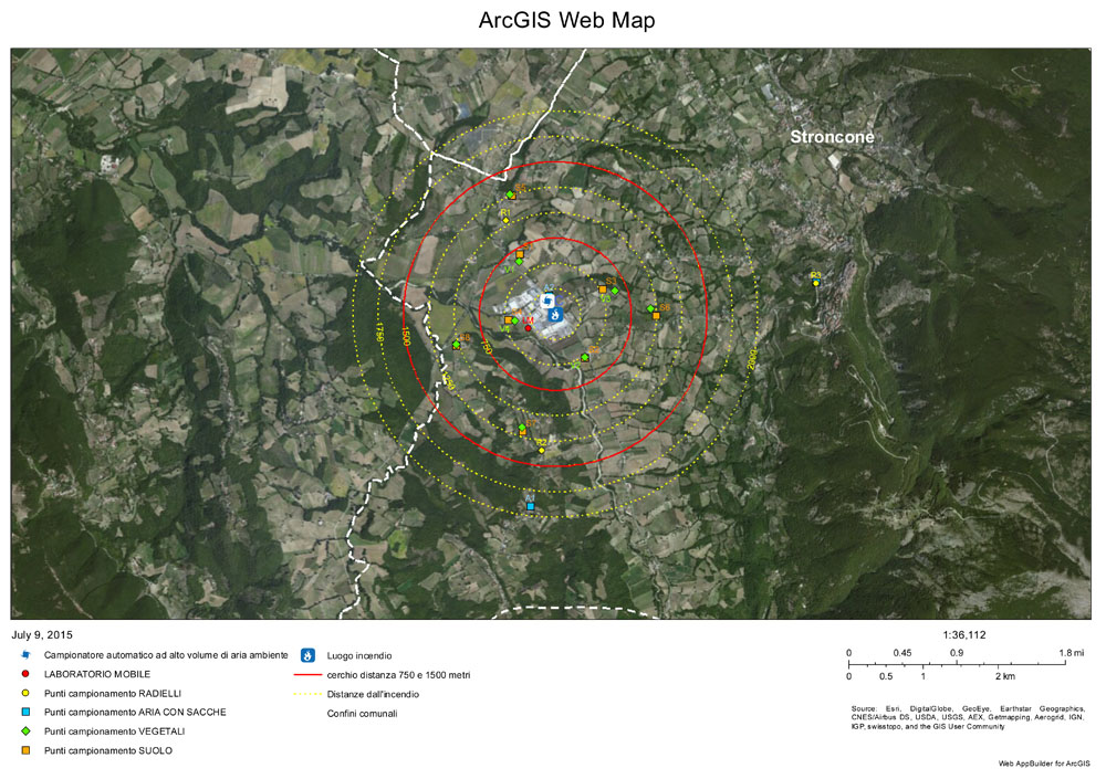 – aria, per misurare microinquinanti organici (Diossine, Furani, PCB, IPA), SOV (Sostanze Organiche Volatili), NO2, CO, SO2, PM10 e PM2,5 sviluppatisi durante l’incendio. Grazie alla presenza del Laboratorio Mobile di Arpa, da circa un mese, nell’area industriale di Vascigliano a una distanza di 290 metri dal luogo dell’incendio (vedi cartina in allegato), si è potuto procedere a una elaborazione comparativa utile a calcolare il contributo diretto dell’evento all’incremento dell’inquinamento dell’aria nell’area.