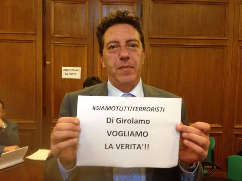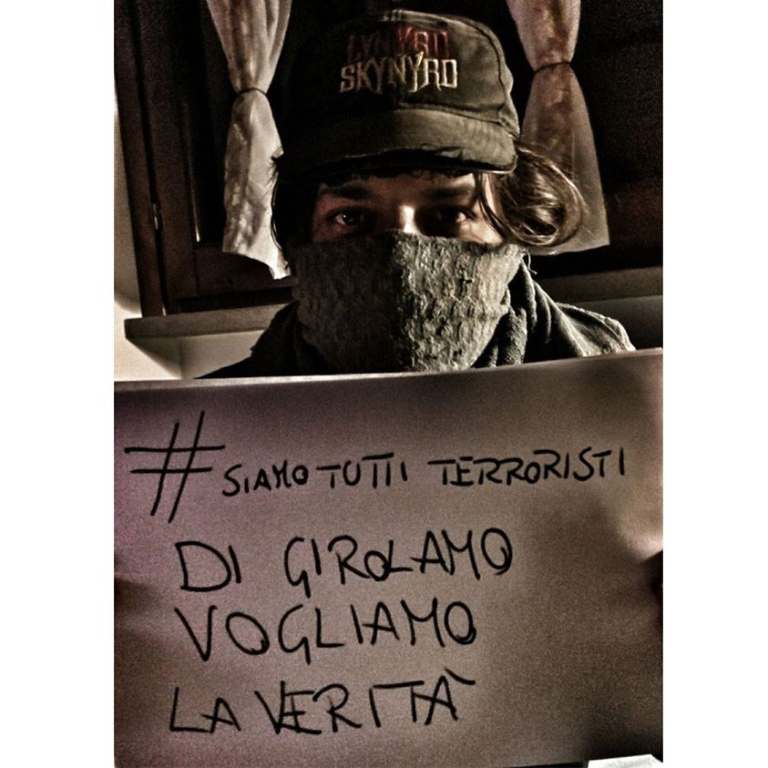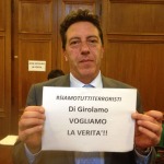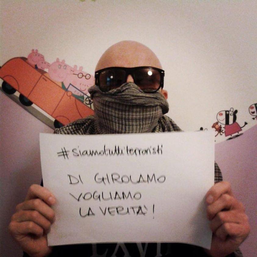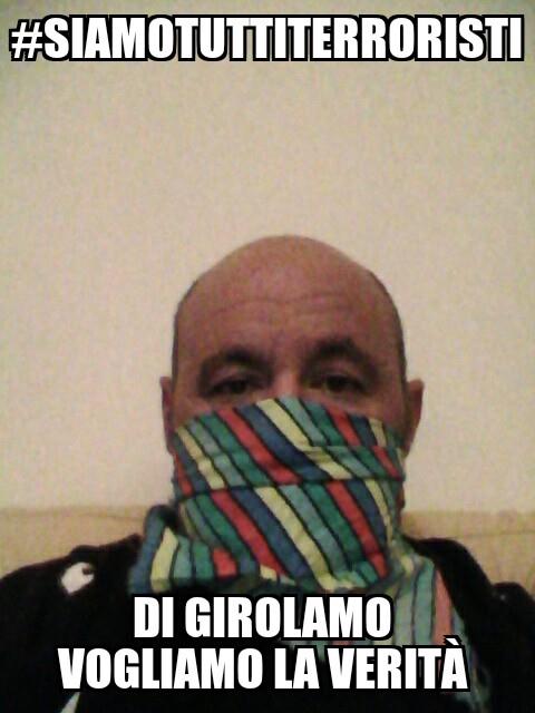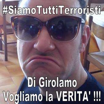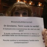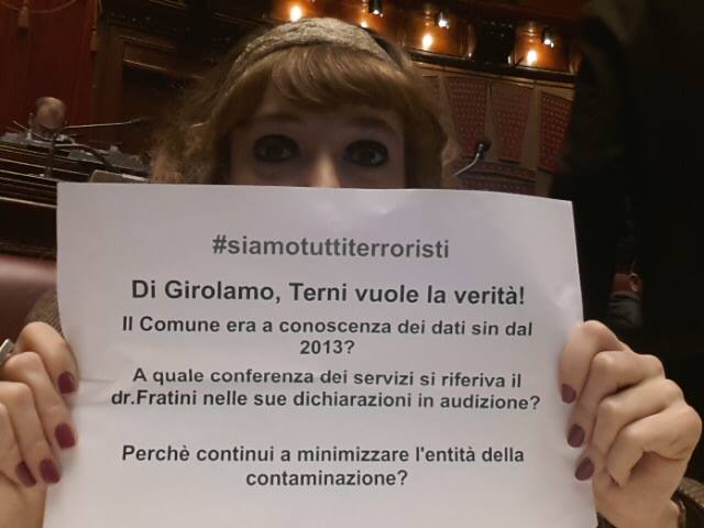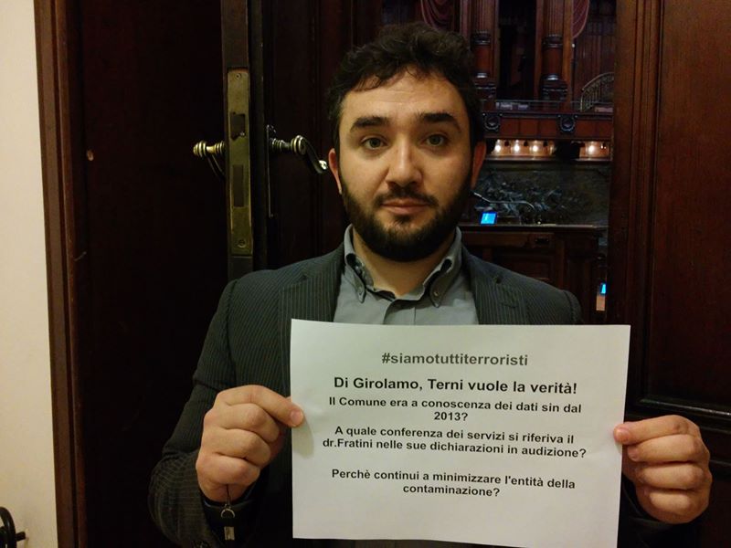 Bocca e naso simbolicamente coperti per proteggersi dalle polveri sottili, in mano un cartello con scritto: “#siamotuttiterroristi Di Girolamo vogliamo la verità”. L’iniziativa l’ha lanciata ieri sera il consigliere comunale del Movimento 5 Stelle, Thomas De Luca, ed in poche ore è stata raccolta e fatta propria da deputati, senatori e decine di semplici cittadini di Terni. La campagna riguarda l’inquinamento della Conca e la contaminazione degli alimenti.