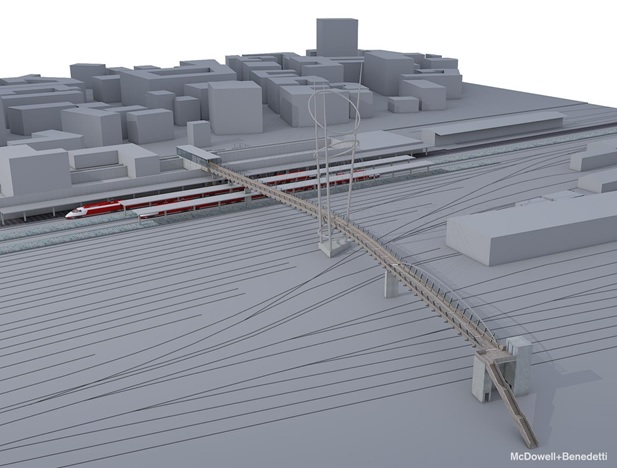 Per l’amministrazione comunale “il percorso pedonale sopraelevato costituisce l’elemento cardine ed il punto di partenza di una strategia più ampia, che prende il via dal riposizionamento oltre la stazione, del principale sistema di attestamento della viabilità esterna al centro città, con i connessi benefici in termini di riduzione delle emissioni di CO2 e tempi di interscambio gomma-rotaia. La consapevolezza dell’importanza di tale ambito quale “porta” della città ed in generale del territorio regionale, in particolare rispetto all’area metropolitana romana, tanto da identificare l’intervento anche come “Umbria Gateway”, ha comportato un forte impegno dell’Amministrazione comunale fin dalle fasi iniziali. Ne è testimonianza la scelta di puntare sulla qualità architettonica attraverso il concorso di progettazione, il pieno coinvolgimento di RFI e Centostazioni SpA fin dalle fasi iniziali con il Protocollo d’intesa siglato in data 13/12/11 e fino alla Convenzione regolante la presenza del manufatto in ambito ferroviario dell’8/07/14, nonché la predisposizione e approvazione della variante urbanistica approvata con DCC n. 45 del 17/02/14, che ha fissato i termini per lo sviluppo e valorizzazione futura dell’intero ambito proprio a partire dal PIT”.