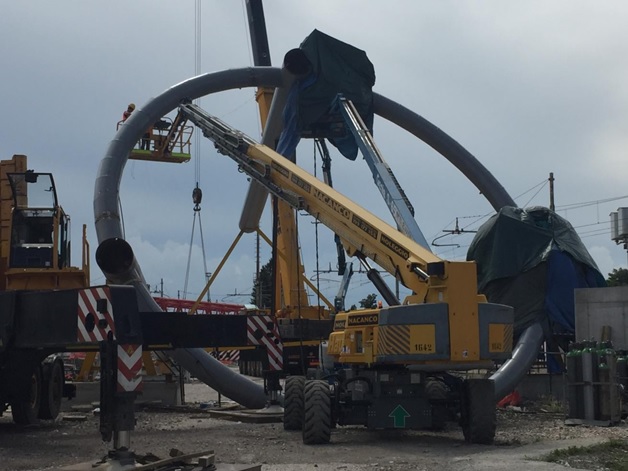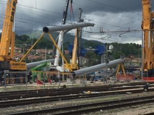 “Con l’approvazione finale del progetto ed in relazione a quanto emerso in sede di Conferenza dei Servizi ed in particolare dalle richieste di RFI e Centostazioni SpA, l’importo originario del contratto d’appalto è passato da € 2.741.815,60 ad € 3.655.386,58 al netto di IVA, portando quello complessivo dell’opera da € 4.310.649,32 ad € 4.721.708,24, di cui il 20% a carico delle risorse comunali e l’80% a carico dei fondi Por- Fesr 2007-13. A valle di tale approvazione, i lavori venivano consegnati in via definitiva a giugno 2015 e sono continuati da allora in modo ininterrotto. In accordo con il cronoprogramma, veniva pertanto dato corso alla realizzazione della testata sud, il corpo vetrato innestato all’interno del fabbricato viaggiatori che ospita l’attestamento della passerella lato Piazza Dante a partire dalle demolizioni dell’esistente e la realizzazione delle fondazioni dell’involucro strutturale, la realizzazione dei due appoggi del ponte in corrispondenza delle banchine e relative fondazioni, nonché tutte le lavorazioni in officina per la predisposizione della carpenteria metallica del ponte e delle componenti speciali, quali gli apparecchi d’appoggio e gli stralli. Parallelamente all’avanzamento del cantiere, sono state portate avanti tutte le interlocuzioni, verifiche e prove sui materiali e sulle componenti dell’opera, come quelle in Galleria del Vento o previste e richieste da RFI e dal collaudatore, al fine di garantire il rispetto di tutti i parametri progettuali in fase costruttiva”.