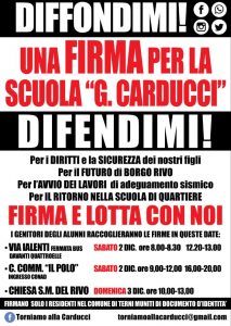 “La petizione, che è la prima di una serie di iniziative, prevede la raccolta di firme autenticate e in questo, i genitori della Carducci, hanno ricevuto la disponibilità di tanti consiglieri comunali, sia dell’opposizione che della maggioranza: ulteriore segno tangibile che l’adeguamento sismico in tempi brevi della Carducci è interesse di un quartiere intero.”