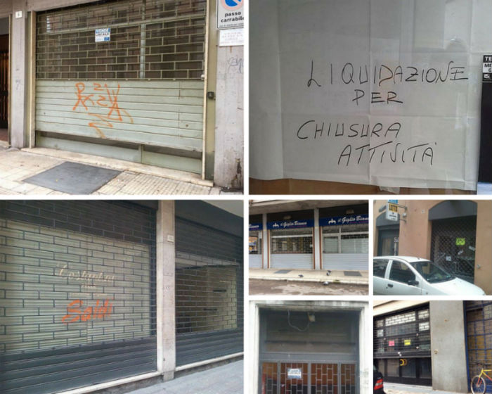 “Un modo concreto per dimostrare la grave crisi che la città sta vivendo. In altre parole la crisi immortalata da una reflex o da un telefonino, che diventa cruda testimonianza. Oltre 90 foto, un brutale censimento, di altrettante attività commerciali di cui oggi restano solo saracinesche abbassate e consumate dalla ruggine, qualche vetrofania staccata o mezza cancellata, tante locandine pubblicitarie utili a coprire le vetrine vuote, qualche insegna che resiste all’usura del tempo ma sopratutto tanti cartelli delle varie agenzie immobiliari per provare ad affittare o vendere.